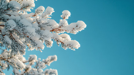 Pine branches weighted down by fresh snow are set against a vibrant blue sky. The scene captures the tranquility and beauty of a winter day, showcasing natures serene charm.