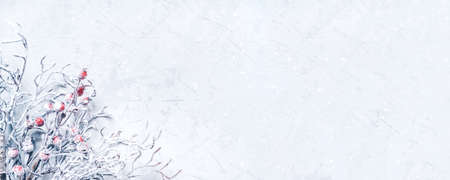 Christmas background of snow-covered branches with berries. Flat lay, top view. Copy space for text.
