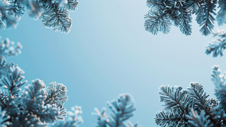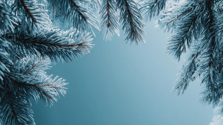 A close-up image of frosty pine branches creates a serene frame against a soft blue background. The delicate ice coating adds a wintry charm, perfect for seasonal themes.
