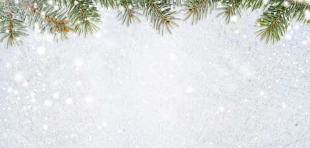 Christmas decoration. Fir branches border on snow background, good for christmas backdrop
