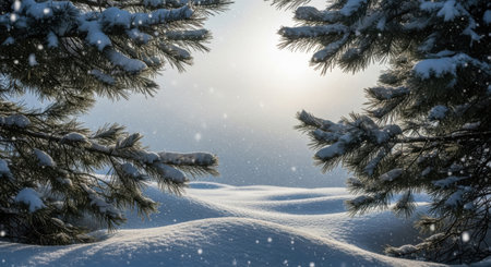 A tranquil winter scene bathed in soft sunlight, featuring snow-covered pine trees and gently falling snow.