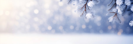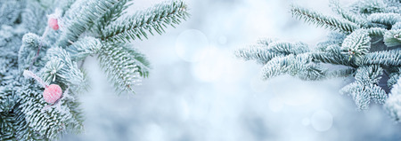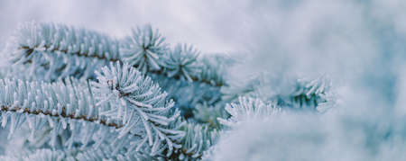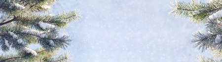Pine branches are covered with hoarfrost in a snowy atmosphere. Winter panoramic banner with snowy pine branches.