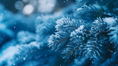 Winter wonderland close up of snowy pine needles scene