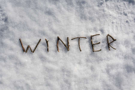 Word Winter on white snow surrounded by fir tree twigs. Christmas and New Year seasonal theme.