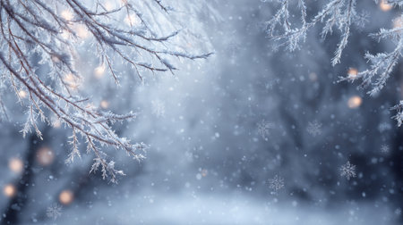 Experience the enchanting beauty of a winter landscape featuring delicate snowflakes falling gently amidst frost-covered branches and a soft, blurred background.