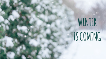 Winter is coming text with winter scene snowy alley in the park. Christmas winter background. Fir tree branch covered with snow in winter day
