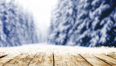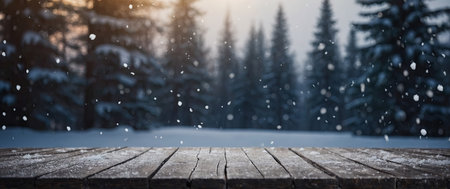 A rustic wooden table covered in snow, set against a blurred winter forest background. Magical bokeh and falling snow create a serene winter scene.