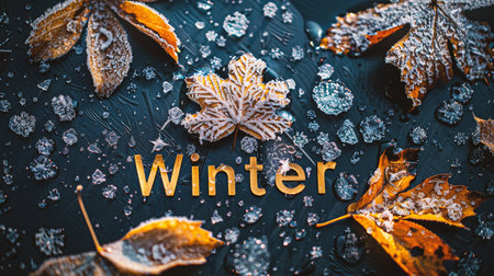 Winter lettering on black background with maple leaves and snowflakes
