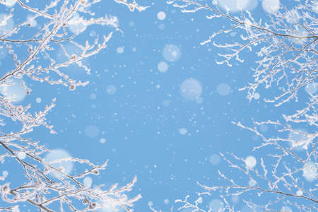 Winter blue background with a frame of hoarfrost on the branches