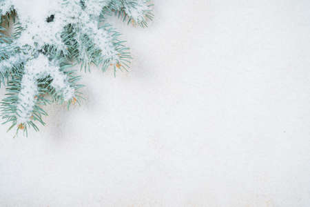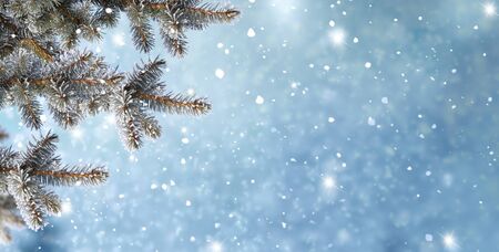 Christmas festive background. Fluffy spruce branches in snow winter landscape. Mock up for postcard copy space banner