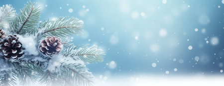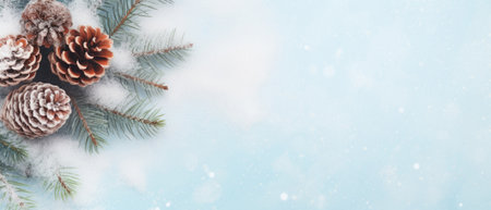 A winter background featuring branches of a coniferous tree adorned with snow and cones. The combination of vibrant green needles, rustic brown cones, and pristine white snow creates a serene and natural winter scene that embodies the beauty of the season.