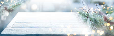 Empty wooden table with hoarfrostand in a winter garden. Horizontal background with fir branches and christmas lights. Short depth of field and space for design and text.