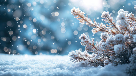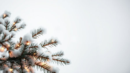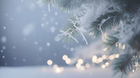 A serene winter scene featuring a snow-covered pine branch and soft bokeh lights.