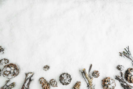 Christmas card. fir branches and cones on white snow. christmas background.