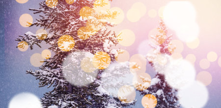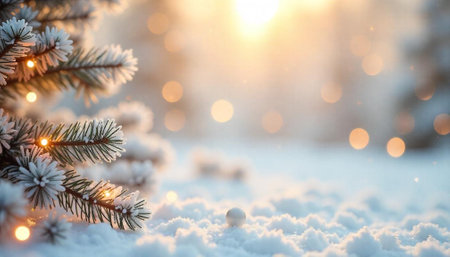 Winter wonderland festive frosted spruce branches with snow drifts and bokeh christmas lights