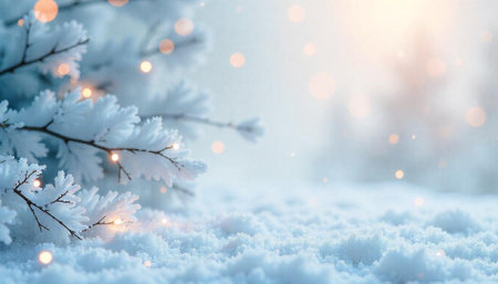 Snowy winter scene with soft lighting and bokeh effect