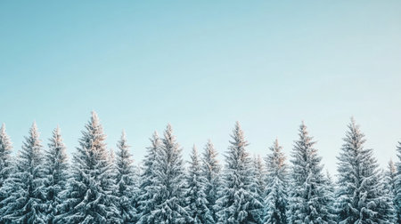 A serene winter landscape featuring snow-covered pine trees under a clear blue sky. This tranquil scene captures the beauty of nature in the cold season.