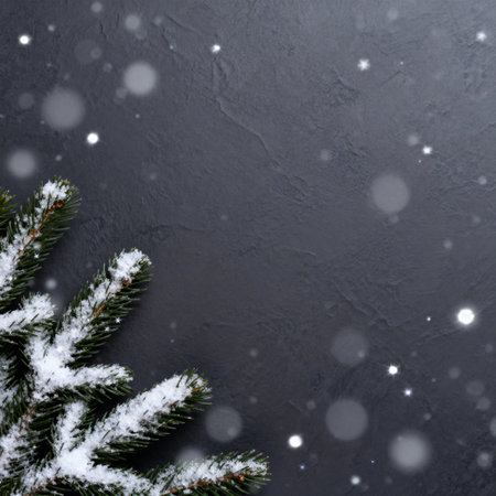 AI generated images. A structured dark gray background, with snowcovered pine tree branches. Background for Christmas.