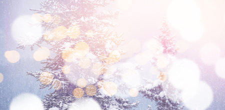 Christmas background. Christmas tree with snow, festive holiday background with bokeh. New Year banner, Christmas scene