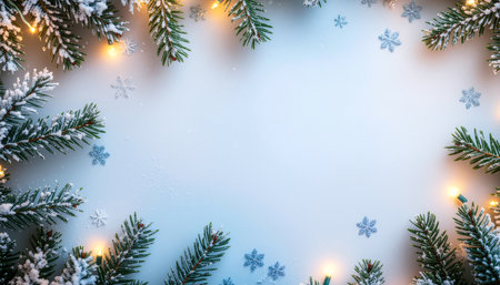 A beautiful arrangement of frosted evergreen branches creates a serene frame around a blank space, ideal for winter designs, holidays, and seasonal greetings.