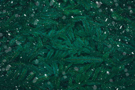 Green dark toned image of snowy coniferous tree branches - ideal for trendy natural winter background decoration.
