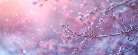 Dreamy winter background with snow-laden branches, soft pink and purple twilight, and gentle snowfall.