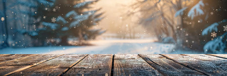 Wooden table and winter forest background with snowflakes and bokeh
