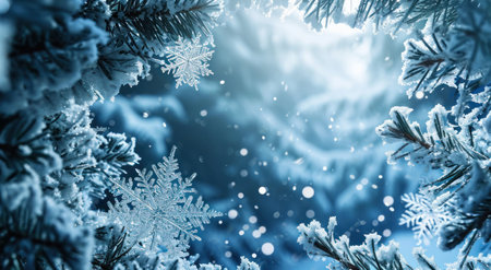 icy snowflake frame around a christmas tree frame.