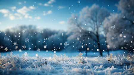 This enchanting winter scene captivates with delicate snowflakes drifting against a serene blue backdrop, perfect for holiday themes that evoke warmth, joy, and delight during the festive season