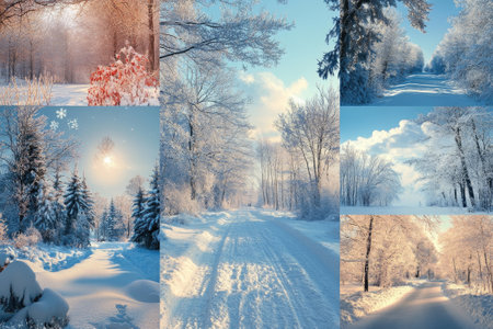 Collage of beautiful winter landscapes showing snowy forests under different lighting and weather conditions