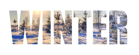 Inscription winter on the background of a frosty day with Christmas trees and the sun