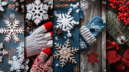 Festive Winter Decor with Snowflakes, Knit Mittens, Pine Cones, and Red Berries