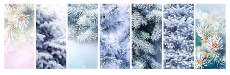 Set of vertical Christmas banners with branch of blue spruce. Collection of Holiday xmas backgrounds with fir tree on abstract backdrop. Copy space for text. Photo toned in blue color