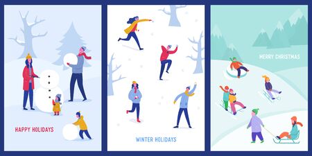 Set of Xmas Party Card or Invitation Poster. People characters on sledges, making snowman, playing in snow, celebrating Merry Christmas and Happy New Year night. Vector illustration