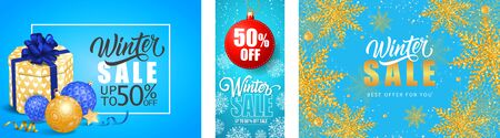 Winter Sale banners set with gifts, snowflakes, New Year baubles and red discount tag on blue background backgrounds. Vector illustration used for festive flyers, posters, leaflets