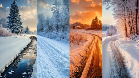 Beautiful winter landscapes showcasing snowy trails, frozen rivers, and serene trees under dynamic skies. Perfect for evoking tranquility and seasonal charm.