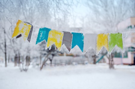 Three bright clothing tags with the words WINTER SALE. Business concept New Year sale. New Year's offers in stores.
