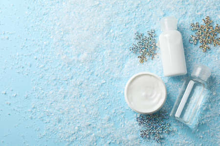 Set cosmetic, winter cream for skin on snowy blue background, space for text. Top view