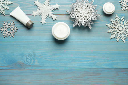 Flat lay composition with cosmetic products and snowflakes on turquoise wooden table, space for text. Winter skin care