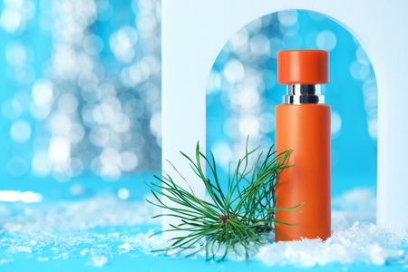 Bottle of perfume, pine branch and artificial snow on light blue background. Space for text