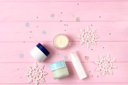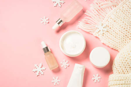 Winter cosmetic, skin care producton pink background.