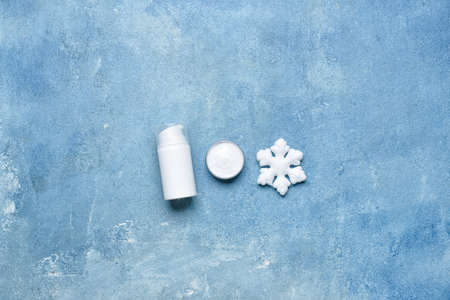 Winter cream for skin on blue top view.