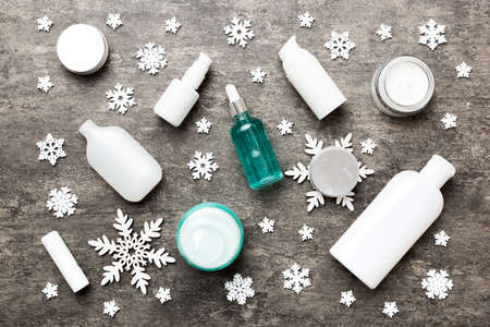 Winter care cosmetics on a colored background top view.