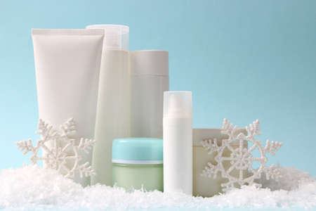 Winter skin care and hand care cosmetic in unbranded containers, bottles, tubes with artificial snowflakes on light blue background. Winter hand skin care cosmetics background top view copy space