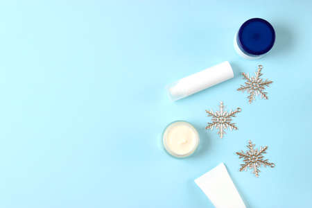 Winter Skin Care products and snowflakes on blue background, flat lay, copy space. Seasonal beauty routine and skin protective cosmetic for winter weather concept.