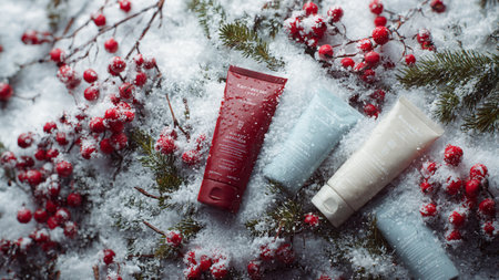 Pine branches frame skincare essentials in snowy theme.
