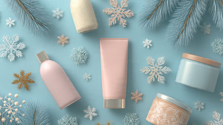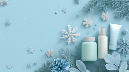Winter skincare set arranged with icy blue tones and pine accents.