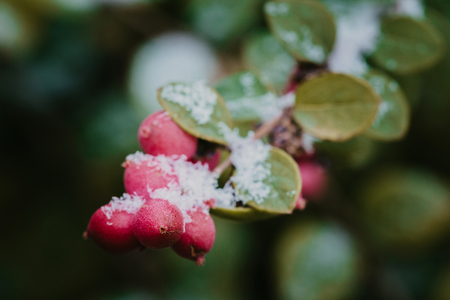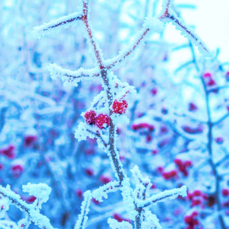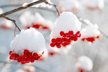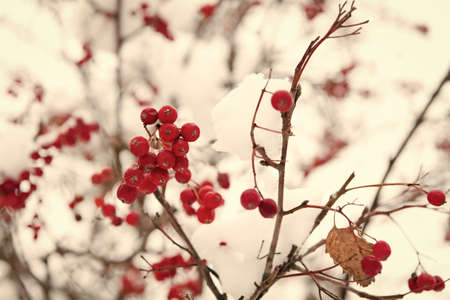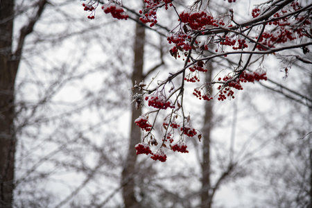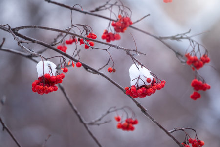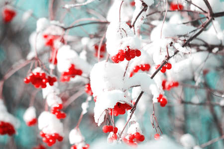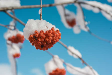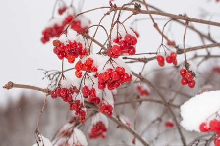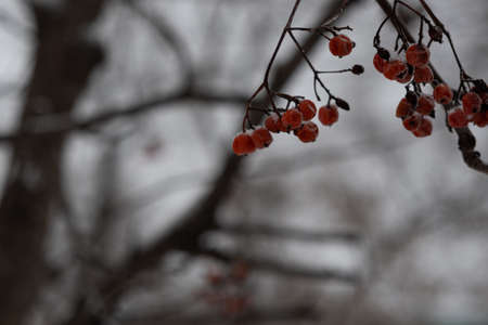 Red rowan clusters are covered with the first snow. Soft focus, blur