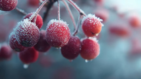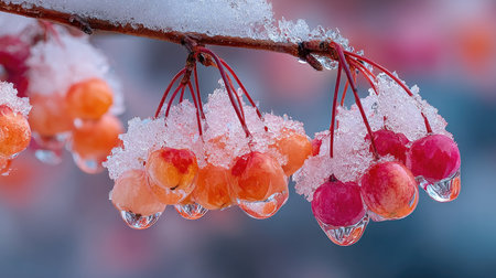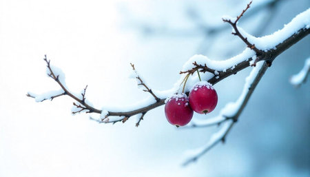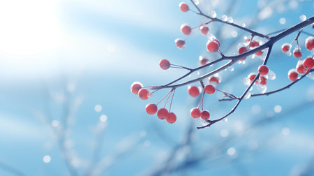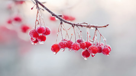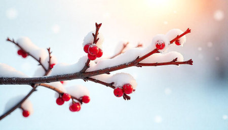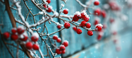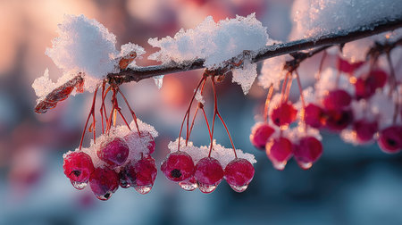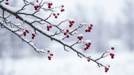 A branch of red berries covered in snow. The image has a peaceful and serene mood