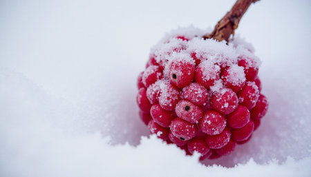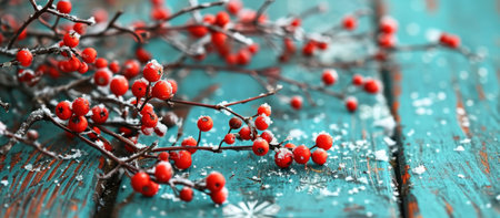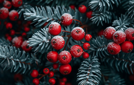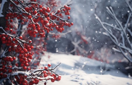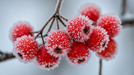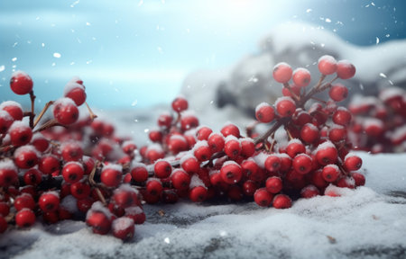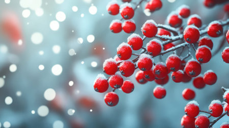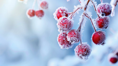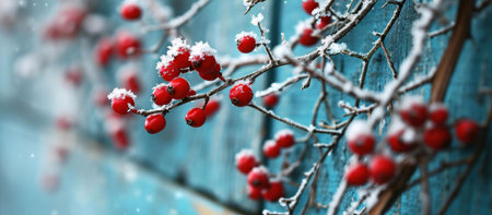 Close-up of red berries covered in snow on a frosty branch. Winter scene, perfect for holidays.